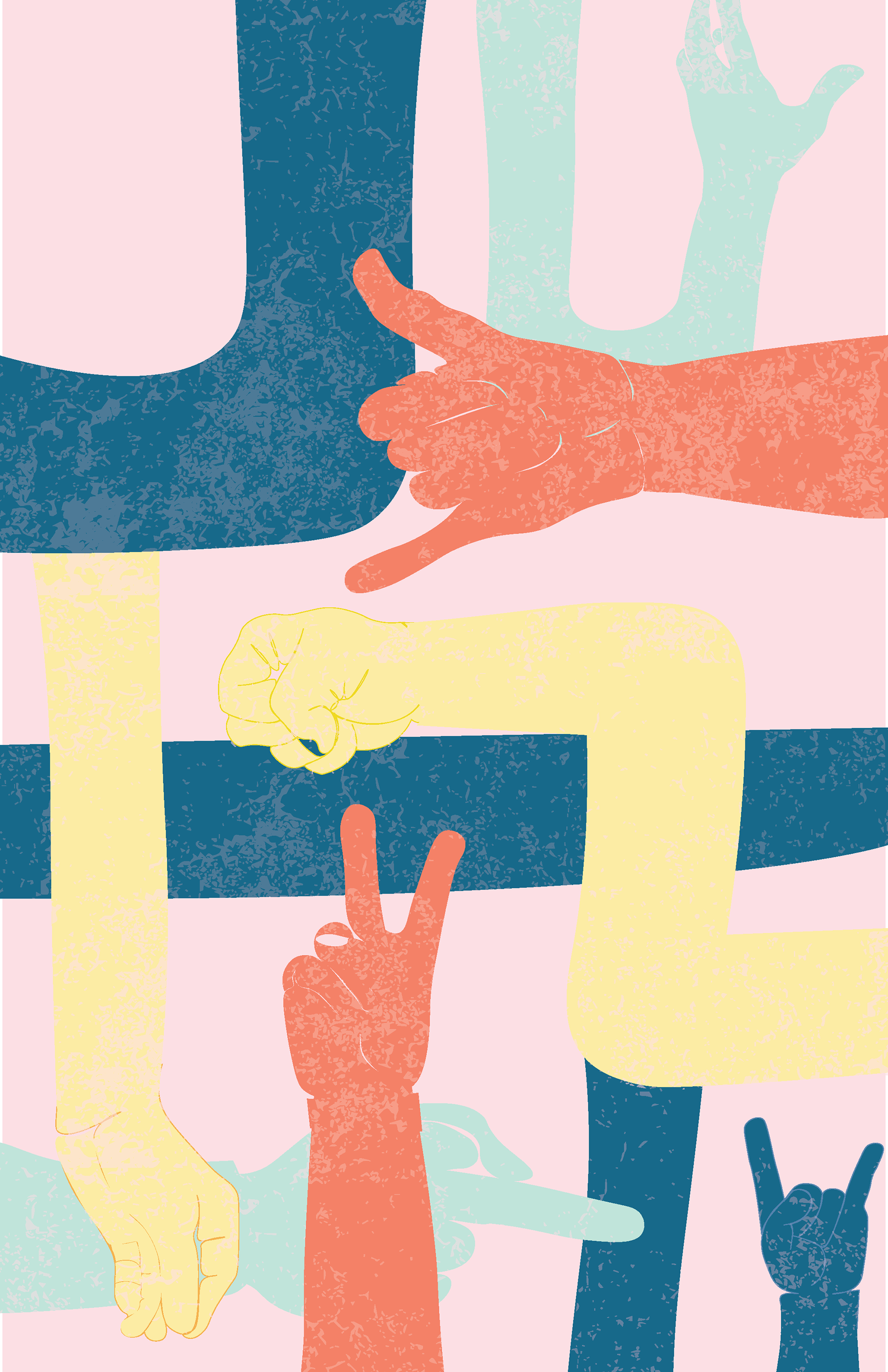 Nothing quite like the physicality of language. Gestures are universal communicators with different meanings. Here the following is illustrated with references to traditional print textures and fun colors.